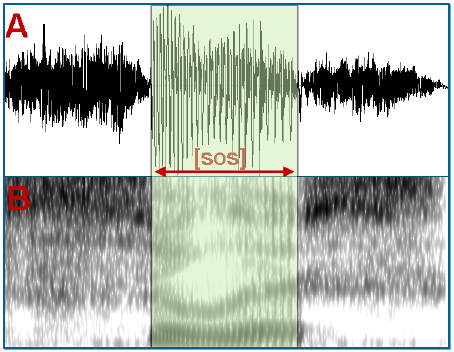Figure 4: Waveform (A) of the nonsense words /sos/ [suəs] and its spectrogram (B).