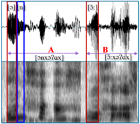 - Nasalised [ɔ̃:] in B is clearly longer (120 ms) than the non-nasalised [ɔ] in A (100 ms).