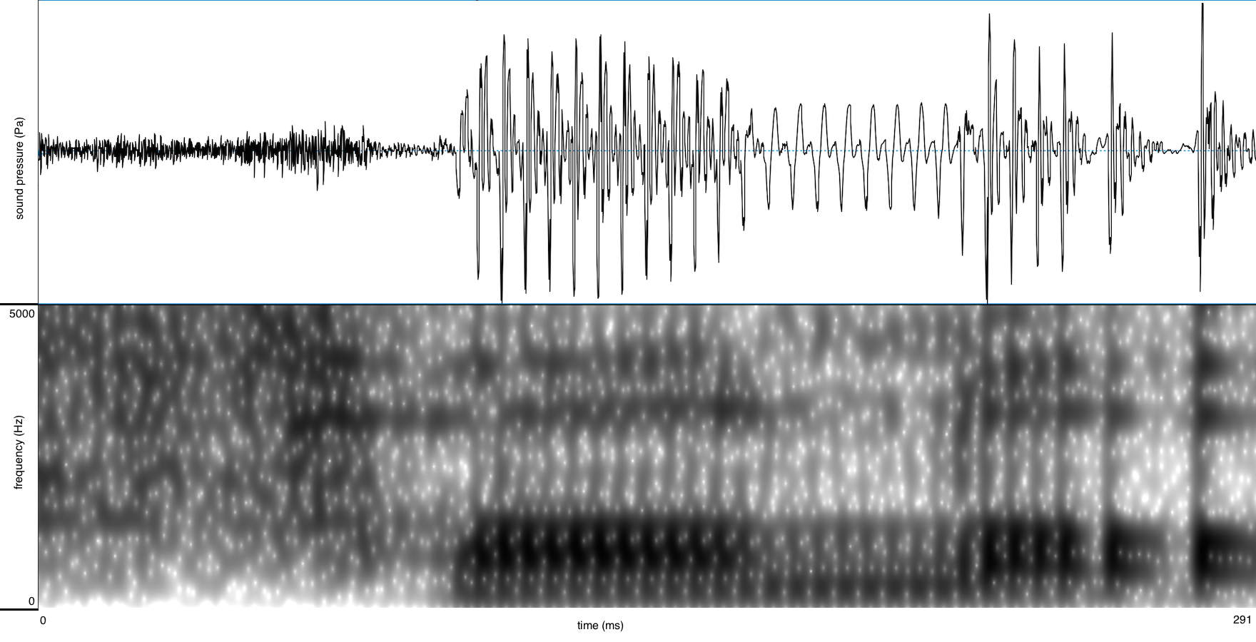 - in obstruents, noise or noise bursts characterised by a relatively low centre of gravity (typically around 4200 Hz), an acute noise peak at low frequency (below 2 kHz) and one or more additional ones. Spectrograms show an identifiable formant structure, as opposed to fricatives and stops at other places of articulation; F2 is the most clearly visible formant.